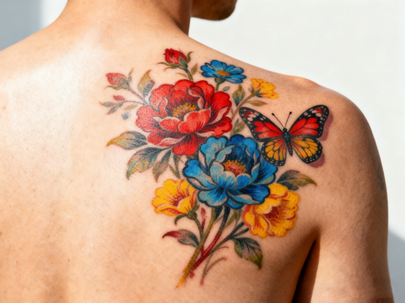 The ink contains more than 3 colors (red, yellow, green, etc.) and penetrates the superficial-middle layer of the dermis. It contains gradients/contrasting colors (such as realistic portraits and watercolor halos), and the ingredients contain heavy metals (red contains mercury and yellow contains cadmium).